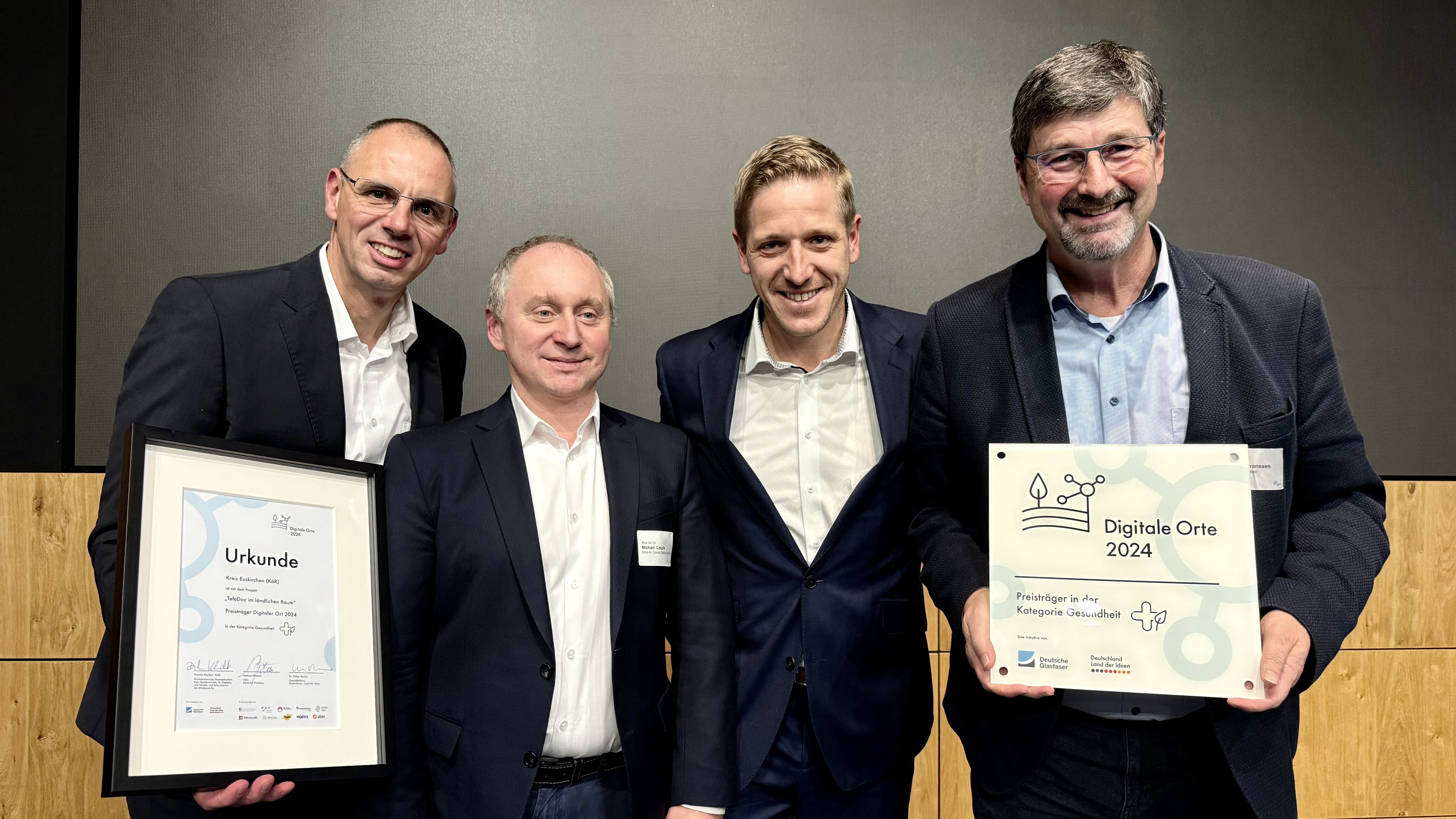 FOTO: Sie freuten sich über die Auszeichnung in Berlin: (v.l.) Werner Haag (AOK), Dr. Michael Czaplik („Docs in Cloud“), Landrat Markus Ramers und Michael Franssen (Struktur- und Wirtschaftsförderung Kreis Euskirchen). Foto: Deutsche Glasfaser/Jana Weinberg