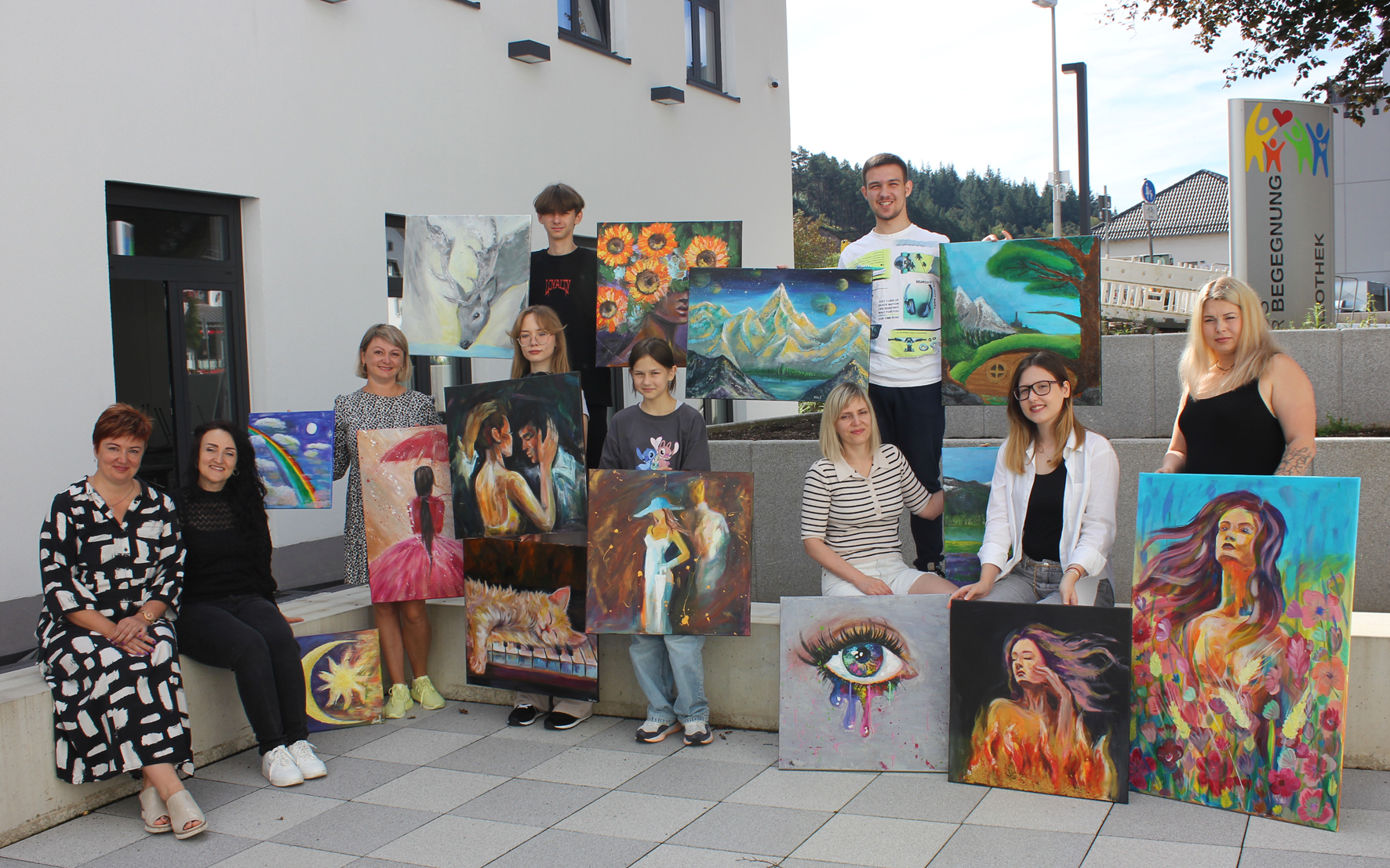 Foto: Case-Managerin Olena Fast (v.l.) und Dozentin Olga Yankovska mit den Teilnehmenden des Kunstprojekts. Foto: Alice Gempfer / Gemeinde Kall