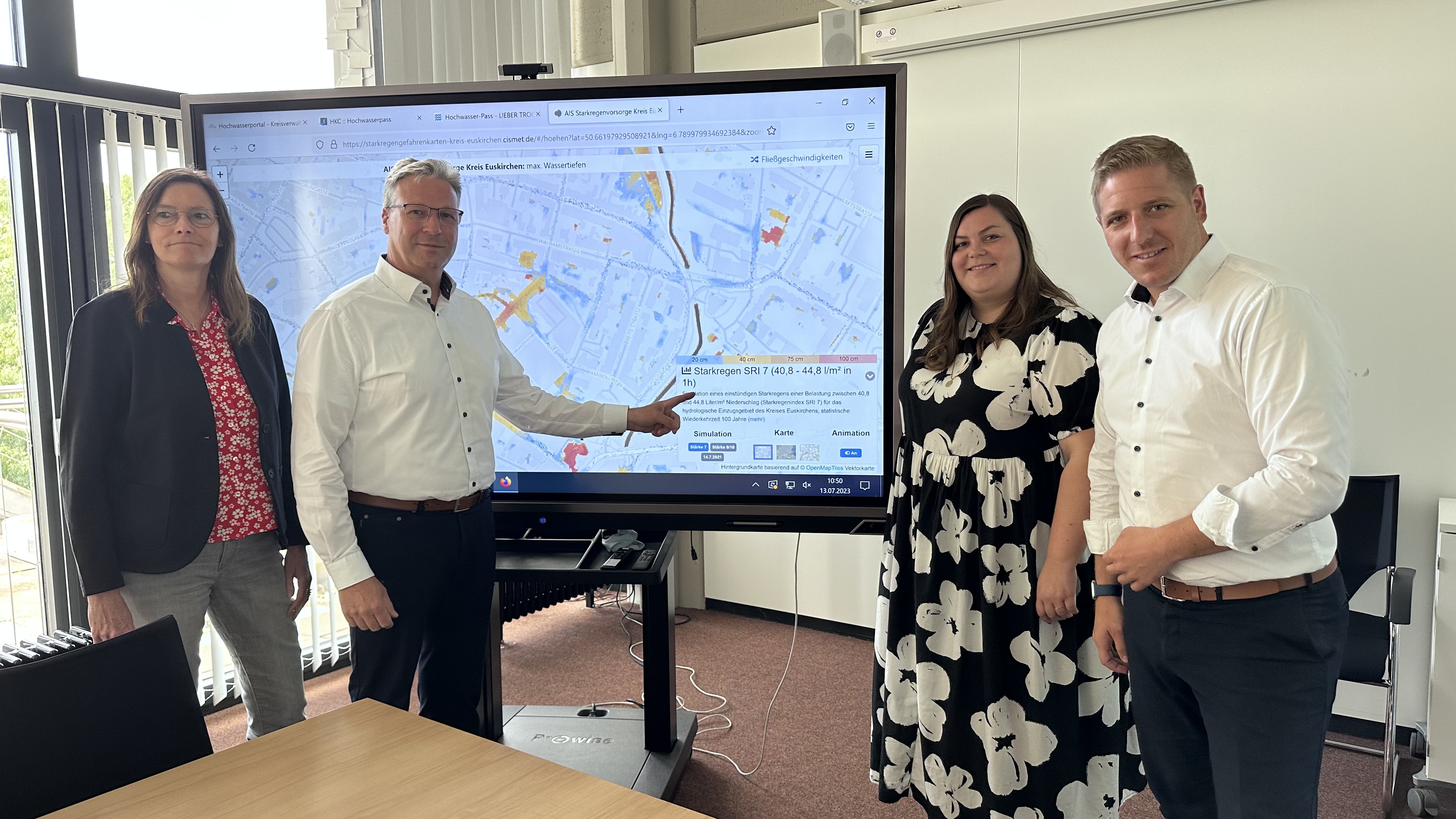 FOTO: Sie stellten die neuen Starkregengefahrenkarten vor: (v.r.) Landrat Markus Ramers, Projektleiterin Sarah Nolting, Achim Blindert (Allgemeiner Vertreter des Landrates) und Heike Schneider (Leiterin der Stabsstelle Wiederaufbau). Foto: W. Andres / Kreisverwaltung