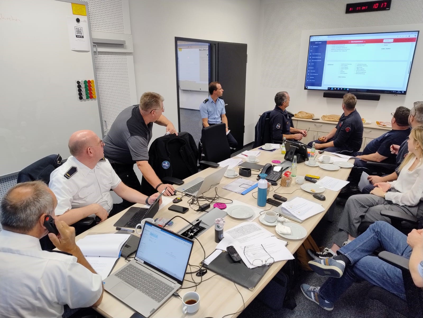 Punkt 10 Uhr begann die Übung mit der ersten Meldung an die Leitstelle Euskirchen. Während der folgenden eineinhalb Stunden lag der Fokus auf der Informationsweitergabe zum Einsatzgeschehen sowie der Anforderung von Unterstützung durch benachbarte deutsche Kreise und den EMRIC-Verbund. Die Übungsleitung speiste mehrere simulierte Vorfälle in das System ein. Die Disponentinnen und Disponenten der Leitstelle Euskirchen waren damit betraut, die Informationen aufzunehmen, mit dem Einsatzleiter vor Ort zu kommunizieren, andere Leitstellen zu informieren sowie über das MOWAS-System Warnmeldungen zur Alarmierung der Bevölkerung im betroffenen Gebiet zu versenden.