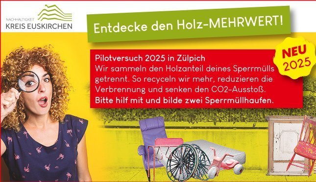 Im Januar 2025 startet unter dem Motto „Holz ist Mehrwert – Trenne deinen Sperrmüll clever!“ ein Modellversuch des Kreises Euskirchen gemeinsam mit der Stadt Zülpich zur getrennten Sperrmüllsammlung. Der Holzanteil des Sperrmülls soll getrennt vom restlichen Sperrmüll in allen Zülpicher Ortsteilen eingesammelt werden. Dadurch soll mehr Holz recycelt werden und weniger in einer Müllverbrennungsanlage verbrannt werden. Ein Projekt für mehr Klimaschutz und den Erhalt von Ressourcen.