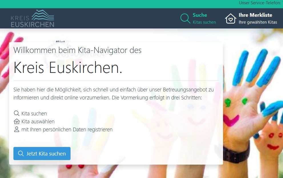 Für alle Kitas im Kreis Euskirchen erfolgt die Anmeldung über den KitaNavigator. Die Kitaplätze werden dann direkt über die jeweiligen Träger der Kindertageseinrichtung oder die Kita direkt vergeben. Über https://kreis-euskirchen.kita-navigator.org gelangt man zum KitaNavigator und kann sich dort online über alle Kitas im Kreis Euskirchen informieren. Zu jeder der rund 160 Kitas kann ein Portrait aufgerufen werden, das die wichtigsten Informationen zusammengefasst und übersichtlich darstellt. Dies soll den Eltern ermöglichen, sich einen ersten Eindruck zu verschaffen und eine Entscheidung zu treffen, welche Kita für ihr Kind in Frage kommt.