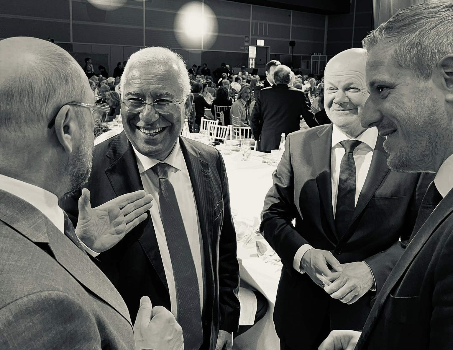 Foto: Landrat Markus Ramers (rechts) beim Festakt in Lissabon im Gespräch mit (v.l.) Martin Schulz, Vorsitzender der Friedrich-Ebert-Stiftung, dem portugiesischen Ministerpräsidenten Antonio Costa und Bundeskanzler Olaf Scholz.