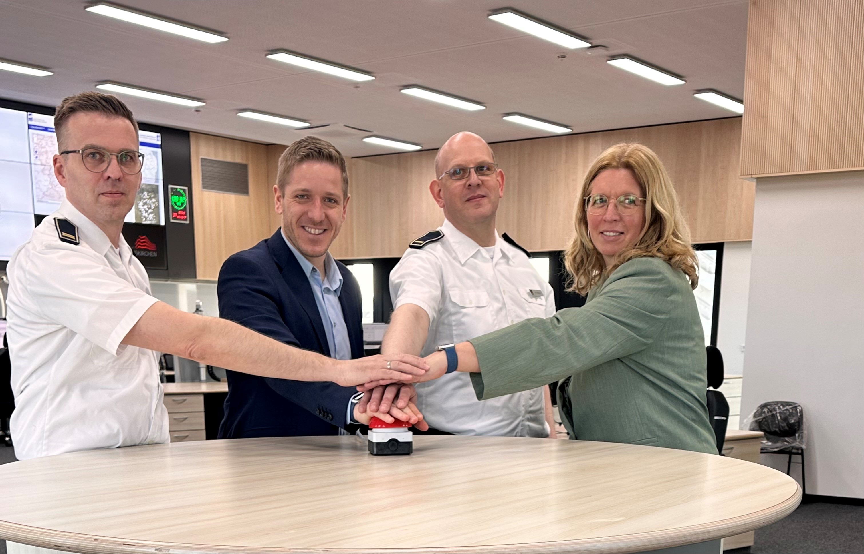 FOTO: Symbolisch drückten sie die Startbutton: (v.l.) Martin Fehrmann (Abteilungsleiter Gefahrenabwehr), Markus Ramers (Landrat des Kreises Euskirchen), Markus Neuburg (Leiter der Leitstelle) und Julia Baron (Geschäftsbereichsleiterin Gefahrenabwehr). Foto: Sven Gnädig / Kreis Euskirchen