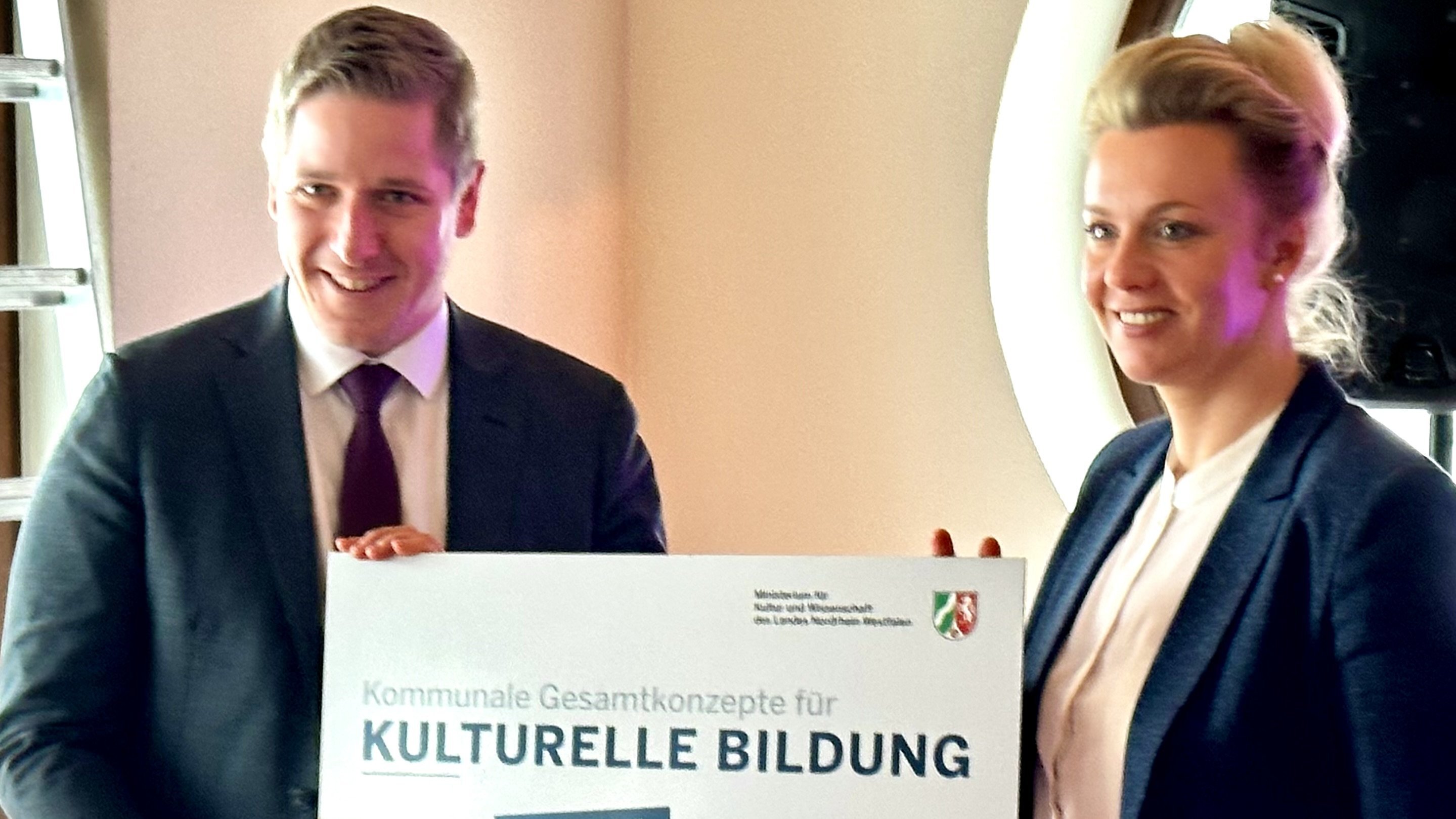 Ina Brandes, Ministerin für Kultur und Wissenschaft des Landes NRW, übergab Landrat Markus Ramers den landesweiten Preis (15.000 Euro) für die „Fortführung des Kommunalen Gesamtkonzeptes für Kulturelle Bildung im Kreis Euskirchen“.