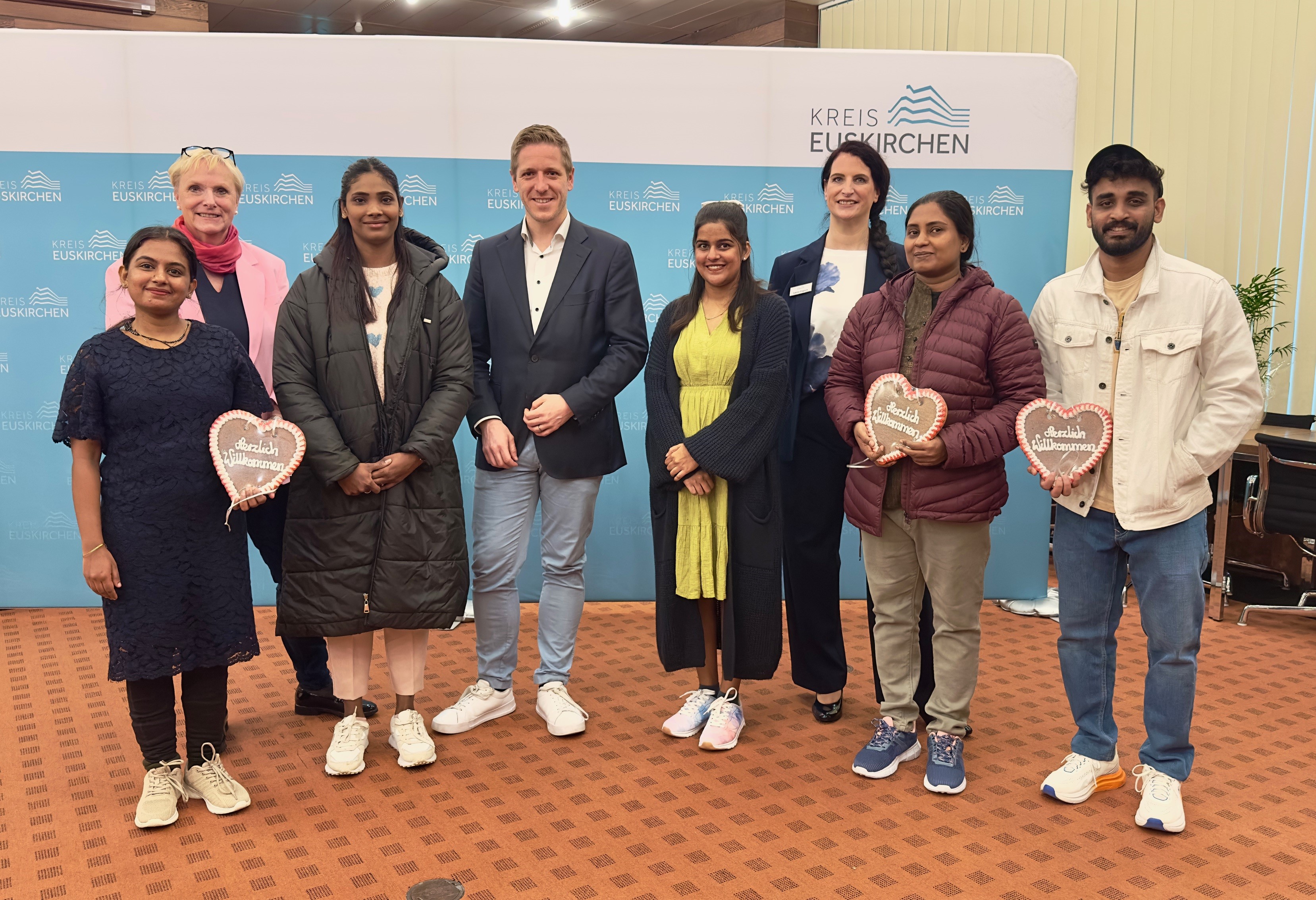 Bei einem kleinen Empfang im Euskirchener Kreishaus wurden die Pflegefachkräfte herzlich willkommen geheißen. Die Basis-Ausbildung haben sie in Indien absolviert, wo sie ebenfalls bereits Deutsch-Sprachkurse belegt haben. Beim Empfang im Kreishaus konnten sie sich schon recht gut auf Deutsch unterhalten.