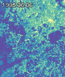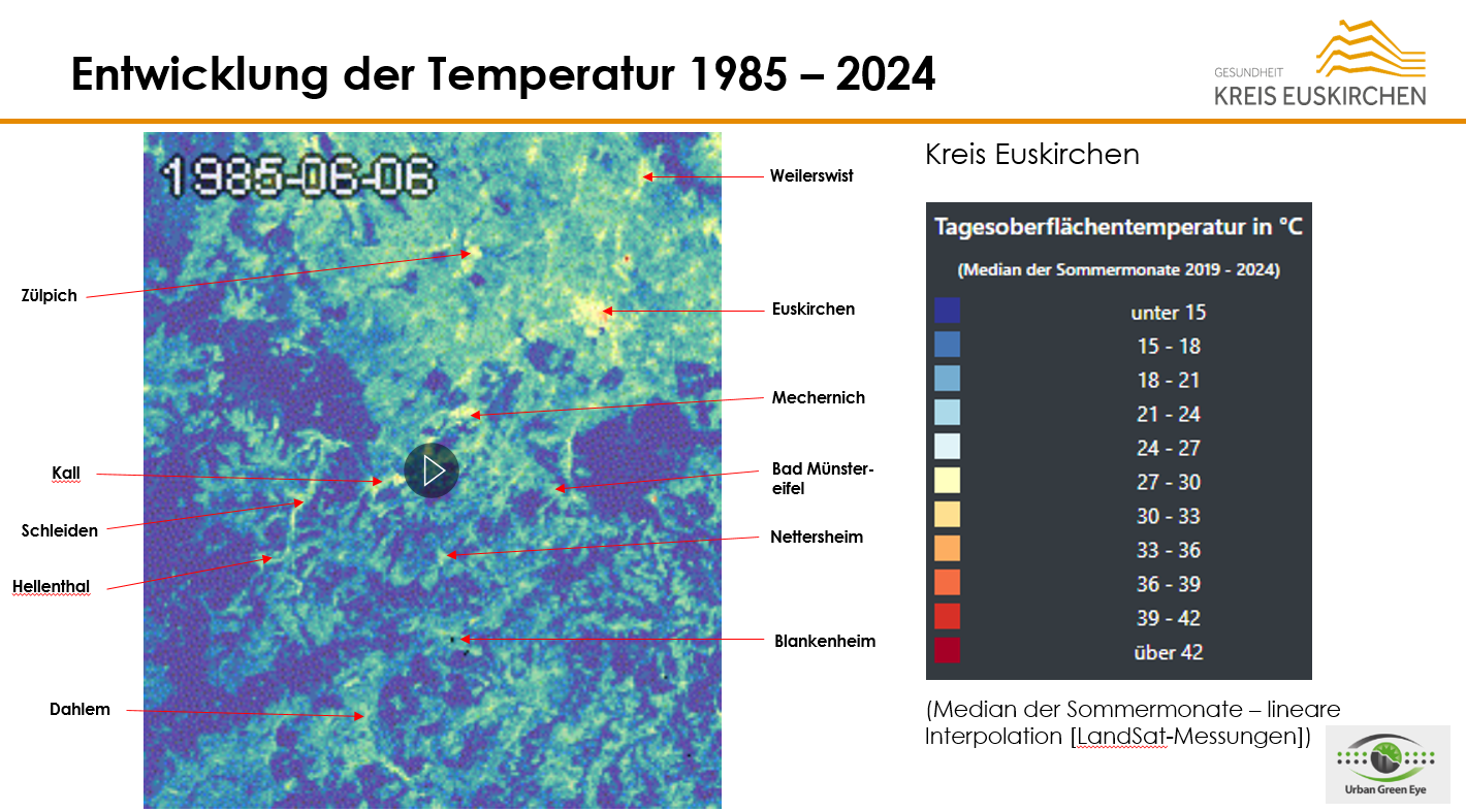 In der Abbildung unten sehen Sie die Tagesüberflächentemperatur im Kreisgebiet im Juni 1985. In der rechts unten befindlichen Animation (Animation.gif (222×260)) können Sie die mediane Temperaturentwicklung der Sommermonate im Kreis Euskirchen über die Jahre 1985 - 2024 verfolgen - diese lineare Interpolation zeigt deutlich die Erwärmung des Kreisgebietes über die Zeit (Animation freundlicherweise zur Verfügung gestellt von: UrbanGreenEye).