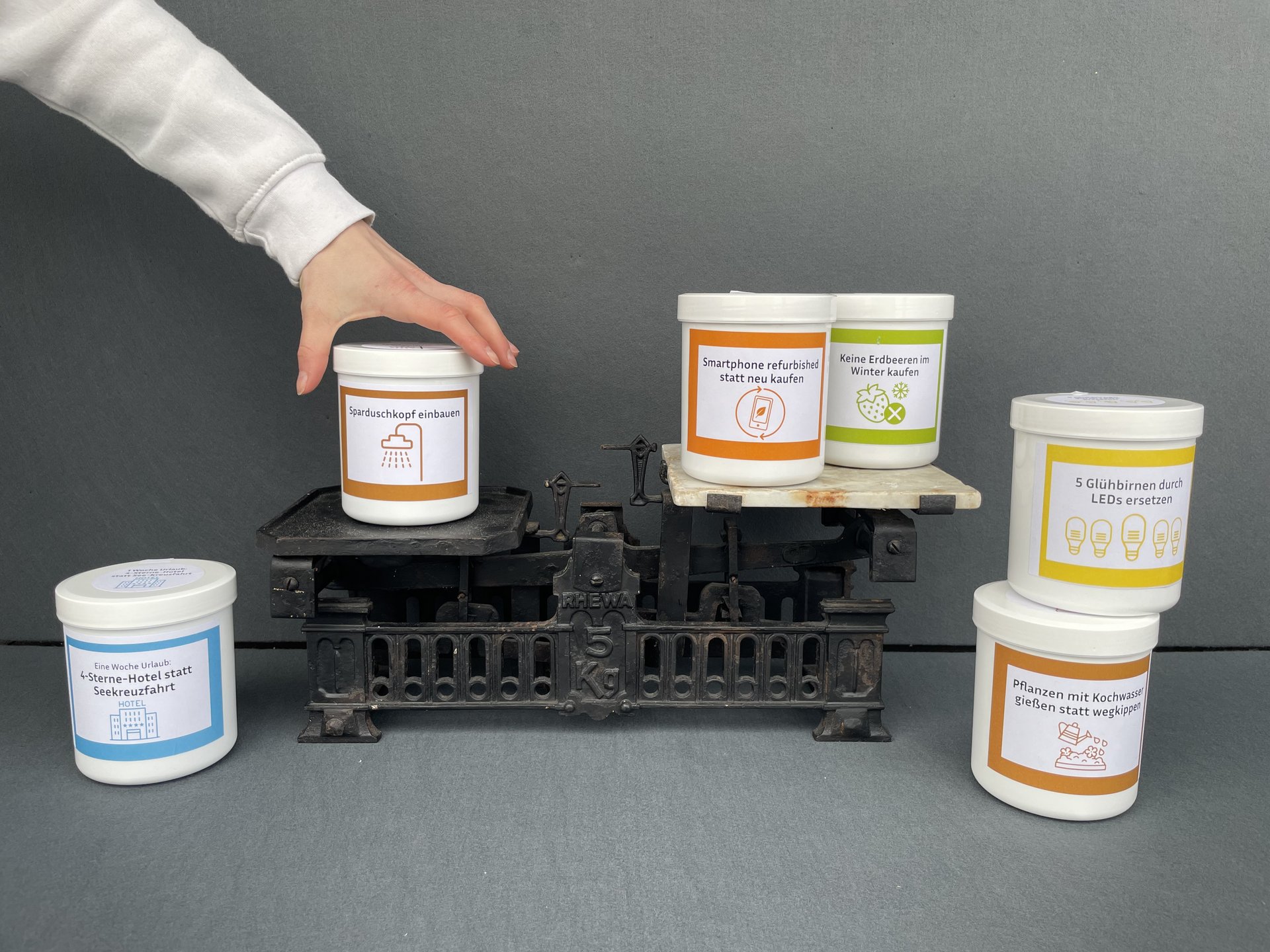 Legen Sie zwei Dosen auf die Waagschalen. Die Seite mit der wirksameren Maßnahme sinkt nach unten. Durch diesen direkten Vergleich wird auf einfache Weise klar, wo die „großen Hebel“ des Klimaschutzes liegen.