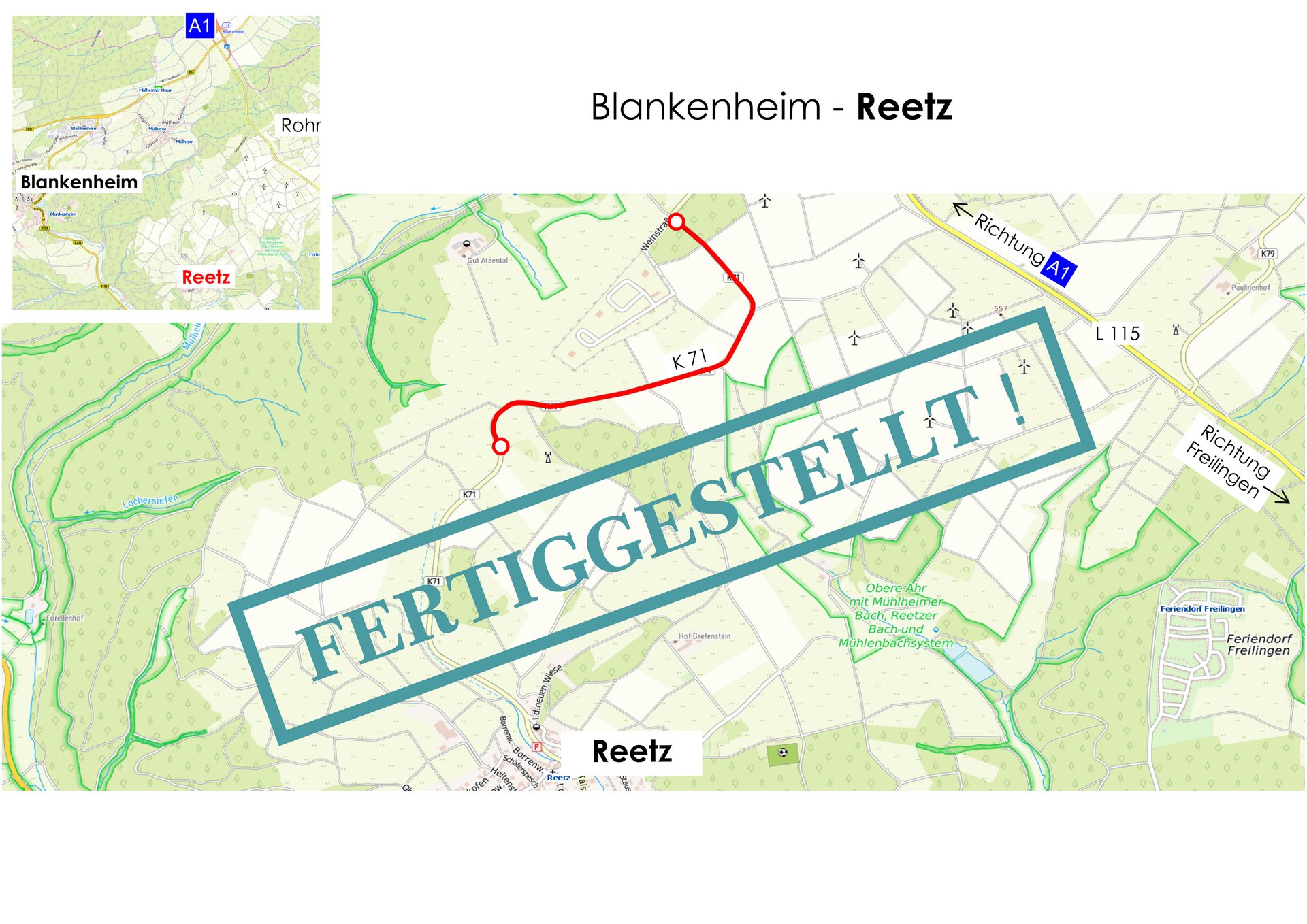Der Kreis Euskirchen plant, die Kreisstraße 71 zwischen der Ortsdurchfahrt Blankenheim-Reetz in Richtung L 115 bis zur Zufahrt zur ehemaligen Nike-Station zu sanieren. In diesem Abschnitt werden die Fahrbahndecke erneuert, die Randbereiche angepasst und die Entwässerungsanlagen nach Bedarf verbessert.